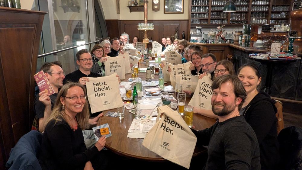 „Das Netzwerk-Event lockte Gäste u.a. aus Thüringen, Dresden, Leipzig, dem Erzgebirge - und natürlich aus Chemnitz an“, so Jens Korch vom Netzwerk Schöne Bücher auf LinkedIn. Für ihn war der Abend ein Heimspiel: Seine Edition Wannenbuch ist in Chemnitz zuhause. Die Goodiebags auf dem Foto mit dem Aufdruck "Fetzt. Übelst. Hier." verteilte übrigens Stefanie Weise vom Tourismusverband Chemnitz.Zwickau.Region.