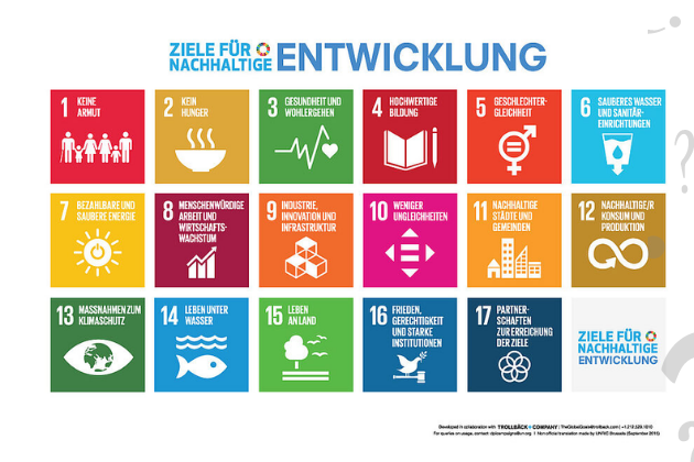 Die 17 Nachhaltigkeitsziele wurden auf dem UN-Gipfel für nachhaltige Entwicklung im September 2015 verabschiedet. Sie reichen von Gesundheit über Gleichstellung der Geschlechter bis hin zu Bildung und sollen weltweit die Anstrengungen zur Beendigung aller Formen von Armut, zur Bekämpfung von Ungleichheiten und zur Bewältigung des Klimawandels mobilisieren. Mehr dazu unter https://17ziele.de/.