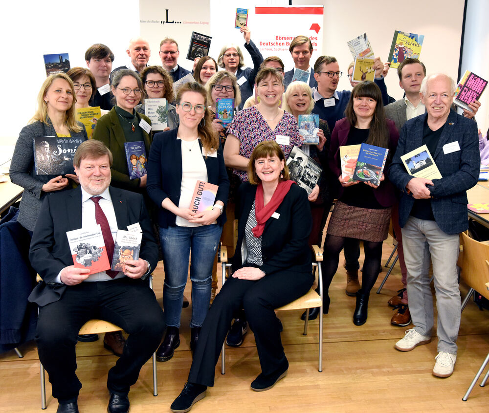 Umso erfreulicher, dass sich nun 24 Verlage aus Sachsen (15), Sachsen-Anhalt (4) und Thüringen (5) mit jeder Menge neuer Bücher im Leipziger Haus des Buches einfanden, wo sie auf so viele neugierige Journalistinnen trafen wie lange nicht. Als die Fotografen von LVZ und Börsenblatt zum Gruppenfoto baten, herrschte ausgelassene Stimmung wie zu den Zeiten von Thomas Gottschalks Saalwetten: Hurra, wir leben noch! Drei Minuten waren für die Präsentation eines jeden Verlags vorgesehen, Börsenvereins-Geschäftsführerin Heike Haupt sorgte mit analoger Glocke und digitaler Stoppuhr für die strikte Einhaltung des Procederes. Das Los legte die Reihenfolge fest.