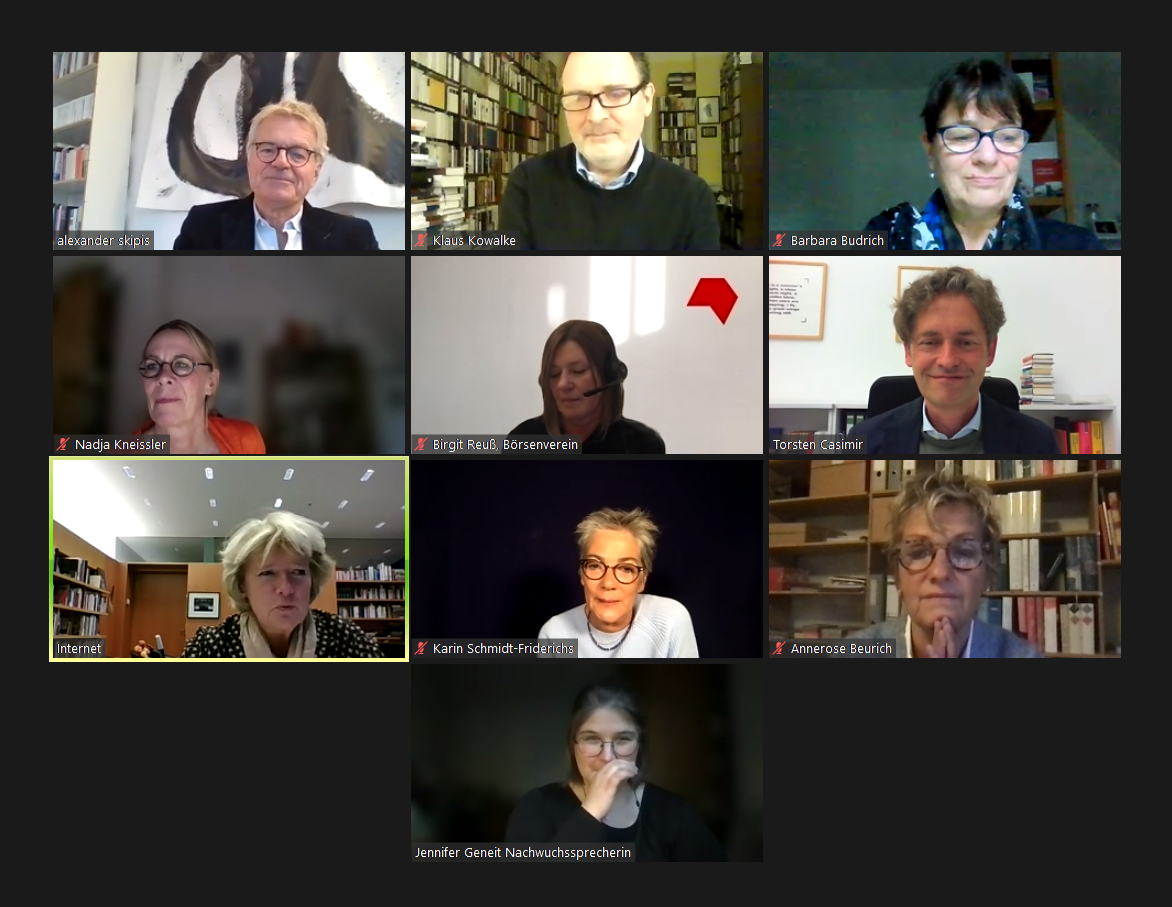 Nota bene, beide Gruppen könnten in puncto strukturelle Verlagsförderung wirksame Komplizen sein. Der VdÜ, Verband der Literaturübersetzer:innen, hat den Verlegerausschuss schon voreiniger Zeit dahingegend angesprochen, und ebenso unsere Gegenüber im Hause Grütters. Ich weiß, dass der jetzige Vorstand meines Verbandes da sehr offen ist.
