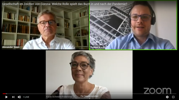 Mitgliederfragen kamen in der Talkrunde vor allem zur Buchmesse. Mit Blick auf die diesjährige "Sonderedition" der Messe (14. – 18. Oktober, mehr dazu hier) plädierten Skipis und Karin Schmidt-Friderichs an die Branche, einen "umgekehrten Domino-Effekt" in Gang zu setzen und zur Buchmesse zu kommen, zumal es großzügige Storno-Regelungen gebe. "Die vielen Unwägbarkeiten, die Corona mit sich bringt, dürfen für uns keinen Stillstand bedeuten", warnte Alexander Skipis: "Wir müssen die Zukunft mitgestalten, mit Perspektiven für das Buch und den gesellschaftlichen Diskurs". Dazu gehöre, die Frankfurter Buchmesse zu ermöglichen.