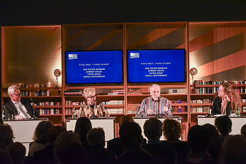 Im Literaturhaus Frankfurt fand ab 19.30 Uhr eine Diskussionsrunde zum Auftakt der Woche der Meinungsfreiheit (3.-10. Mai) statt. Thema: "Freies Wort – freies Europa?" Die Veranstaltung war eine Kooperation zwischen dem Börsenverein des Deutschen Buchhandels, der Koordinationsstelle EU-Angelegenheiten des Dezernats V der Stadt Frankfurt am Amin und des S. Fischer Verlags, als Teil der Initiative "Wissen Erinnern Fragen" des Frankfurter Verlags. Über den wachsenden Einfluss populistischer und autokratischer Strömungen in vielen Ländern Europas sprachen, einen Monat vor der wichtigen Europawahl am 9. Juni, der Historiker Jan-Pieter Barbian, der Schriftsteller und Historiker György Dalos sowie die Journalistin und Autorin Petra Reski. Moderiert wurde das Podium von Shelly Kupferberg.