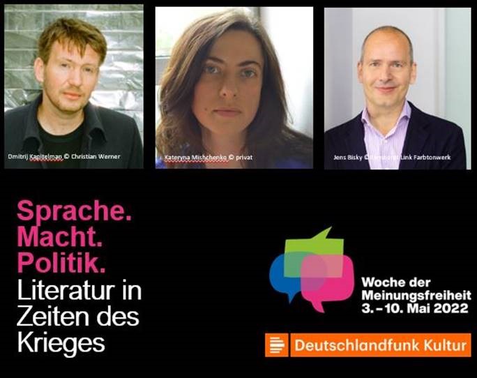 Das Gespräch wurde am 6. Mai von Deutschlandfunk Kultur in Berlin aufgezeichnet. Die Aufzeichnung ist online abrufbar auf: https://deutschlandfunkkultur.de/literatur-krieg-meinungsfreiheit-ukraine-sprache-macht-100.html, auf der Website www.woche-der-meinungsfreiheit.de und unter www.buchmesse.de/news.