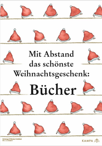 Zu den von dem Kölner Illustrator gezeichneten Abstandsmarkierungen hat der Kampa Verlag auch noch ein Plakat für Schaufenster oder Büchertische produziert. "Denn Bücher sind und bleiben das mit Abstand schönste (Weihnachts-)Geschenk", meint Vertriebsleiterin Anica Jonas und möchte Buchhandlungen im Weihnachtsgeschäft unterstützen, damit der Abstand zumindest etwas weihnachtlich geregelt werden kann. Das Dekoset enthält sechs selbstklebende Abstandsmarkierungen im Format 59,4 x 5 cm sowie das A2-Plakat und kann von den Buchhandlungen unter jonas@kampaverlag.ch bestellt werden. Der Versand des Sets erfolgt in der Reihenfolge des Bestelleingangs ab Mitte November – solange der Vorrat reicht.