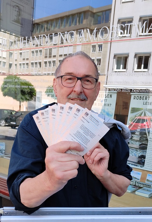 Der Inhaber der Augsburger Buchhandlung am Obstmarkt verlost für den kommenden Monat Juli insgesamt zehn 9-Euro-Tickets. Die Gewinner:innen werden ausgelost: Wer in den Verlosungstopf kommen will, muss vorher per Mitmach-Karte, E-Mail oder als Kommentar bei der Facebook-Seite der Buchhandlung einen deutschen Reise-Ort nennen, den er gerne mit dem 9-Euro-Ticket besuchen will.