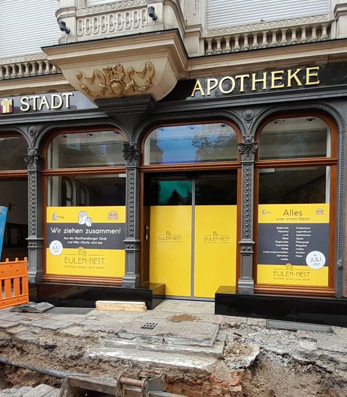 Mit der Alles-unter-einem-Dach-Lösung wollen Tanja Eger und Josua Straß nicht nur Kompetenzen bündeln, sondern auch Team und Geschäftsleistung besser koordinieren. "In Zeiten von fehlendem Nachwuchs – trotz eigener Ausbildungsplätze – und einem immer größeren Bedarf von Leseförderung in der Region fällt es immer öfter schwer, den Ausfall oder die Abwesenheit von Fachkräften zu kompensieren", zieht Eger aktuell Bilanz. Im neuen Ladenlokal könne man ab Juli nicht nur die Teams zusammenführen, sondern auch durch einen im Bürobereich vorhandenen Seminarraum für knapp 30 Personen sogar bei laufendem Betrieb Veranstaltungen und Fortbildungen realisieren.