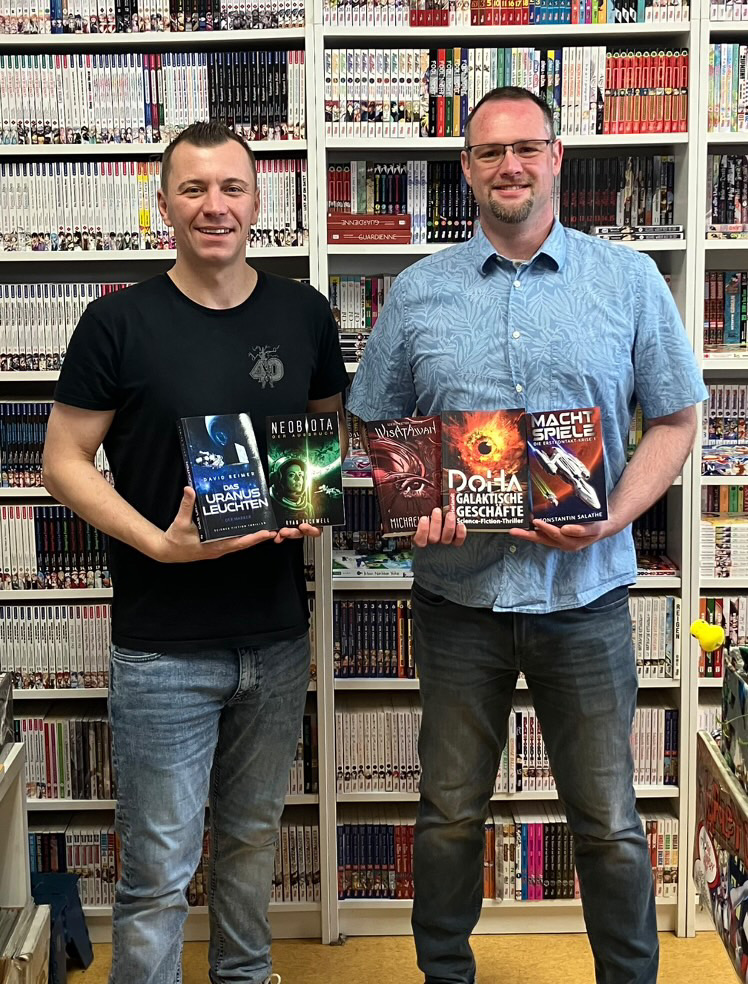 Salathé hat befreundete Autoren angesprochen, und vier haben sich neben ihm an der Aktion beteiligt: die deutschen Autoren David Reimer, Ryan Rockwell, Erik Harlandt und der Österreicher Michael Hirtzy. Alle fünf sind als Selfpublisher und als Verlagsautoren unterwegs, so Salathé. Die gespendeten Bücher stammen teils aus den Beständen der Autoren, für einen anderen Teil haben sie die Druckkosten übernommen (meist für PoD). Zusammengekommen sind bei Salathé über 80 Bücher, bei 30 unterschiedlichen Titeln – alles Science-Fiction-Romane. Deren Wert schätzt er auf rund 1.500 Euro ein. Es handele sich um die meistverkauften Titel der Autoren, etwa: "Machtspiele" (Salathé), "Entropie" (Harlandt), "Explorers" (Rockwell), "Aleyna" (Hirtzy), "Transfer" (Reimer). "Der komplette Verkaufserlös bleibt in den Händen des Fantastic Store", erklärt Salathé.