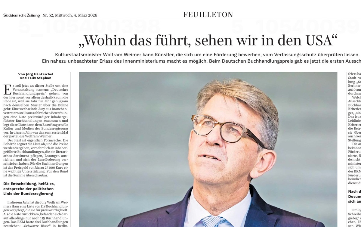 Zum SZ-Artikel: Deutscher Buchhandlungspreis: Weimer schließt Buchhandlungen nach Prüfung durch Verfassungsschutz aus - Kultur - SZ.de