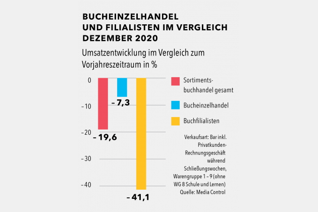 Wie die Zahlen belegen, mussten die Filialisten im Dezember ein Umsatzminus von 41,1 Prozent hinnehmen, während die Bucheinzelhändler den letzten Monat des Jahres 2020 mit einem Rückgang von lediglich 7,3 Prozent abgeschlossen haben. In Summe schlug für den gesamten Sortimentsbuchhandel ein Minus von 19,6 Prozent zu Buche.