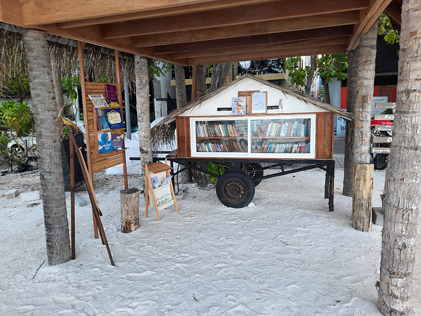 Seit 2018 können sich Buchhändler:innen jährlich auf eine Stelle in einem 5-Sterne-Luxusresort im Baa-Atoll der Soneva Resorts bewerben. Der Pop-Up Buchladen schaffe den ultimativen Freiraum für bibliophile Menschen auf einer einsamen Insel, heißt es in der Stellenausschreibung: „Barefoot Bookselling an einem der schönsten Orte der Welt.“