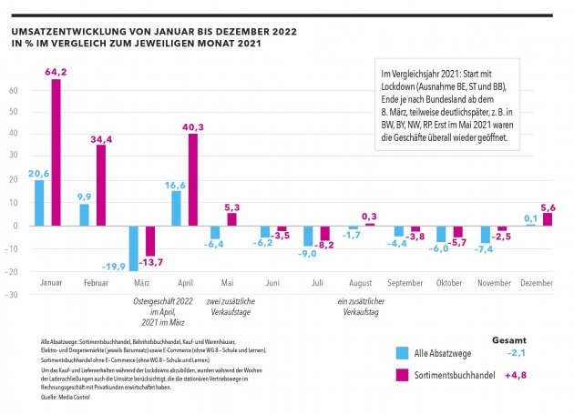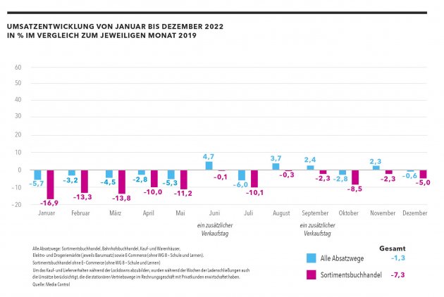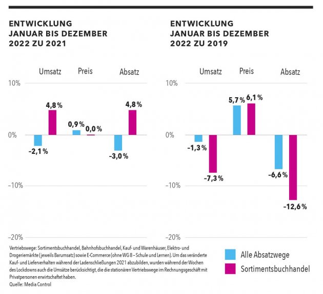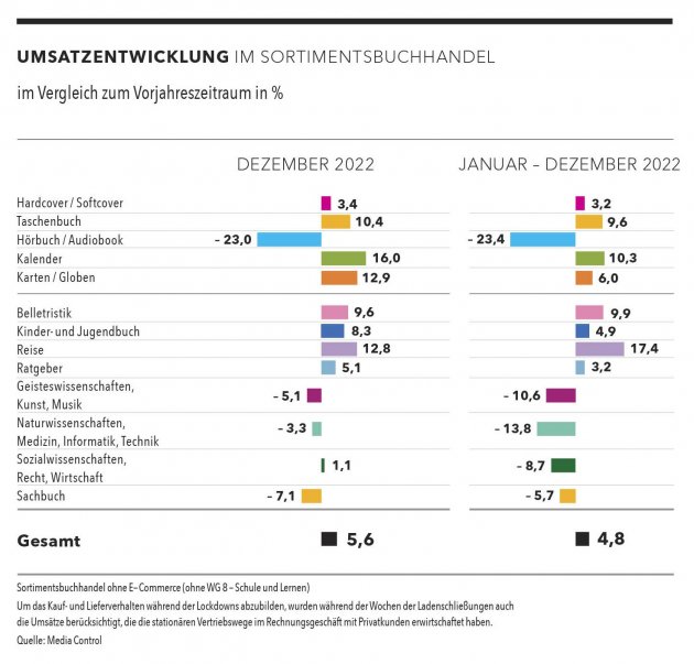 Zurück zur Jahresbilanz: Bei der Auswertung aller Vertriebswege zeigt sich, dass die Bilanz etwas schlechter ausgefallen wäre, wenn sich die Durchschnittspreise pro verkauftem Buch nicht leicht erhöht hätten. Im Schnitt berappten die Kunden durchschnittlich 14,37 Euro für einen Titel, das sind 0,9 Prozent mehr als 2021. Die abverkauften Mengen hingegen reduzierten sich um drei Prozent. Bei den Editionsformen sicherten sich die Taschenbücher mit einem Umsatzplus 3,5 Prozent den größten Zuwachs. Hard- und Softcover büßten hingegen 3,6 Prozent der Umsätze ein.