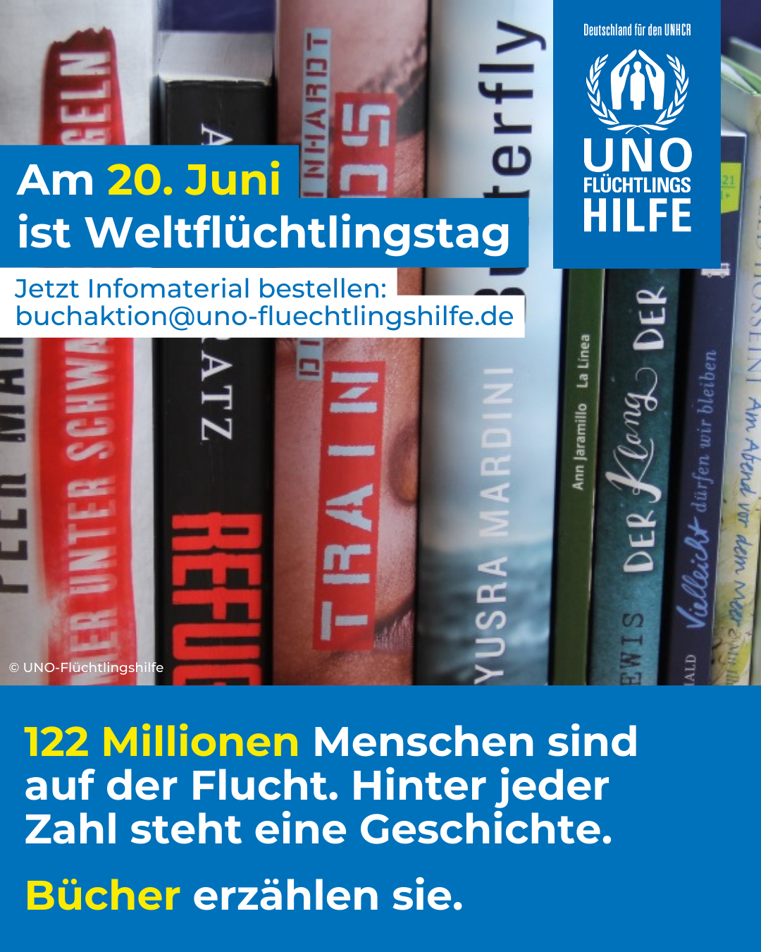 Zum Weltflüchtlingstag am 20. Juni will die UNO-Flüchtlingshilfe wieder gemeinsam mit dem Buchhandel ein Zeichen setzen und Menschen das Thema „Flucht“ über entsprechende Bücher näherbringen. Dafür wurde ein kostenloses Info-Paket geschnürt, mit dem der Buchhandel Schaufenster oder Büchertische gestalten kann. Das Infomaterial kann bis zum 13. Juni per Mail bestellt werden: buchaktion@uno-fluechtlingshilfe.de