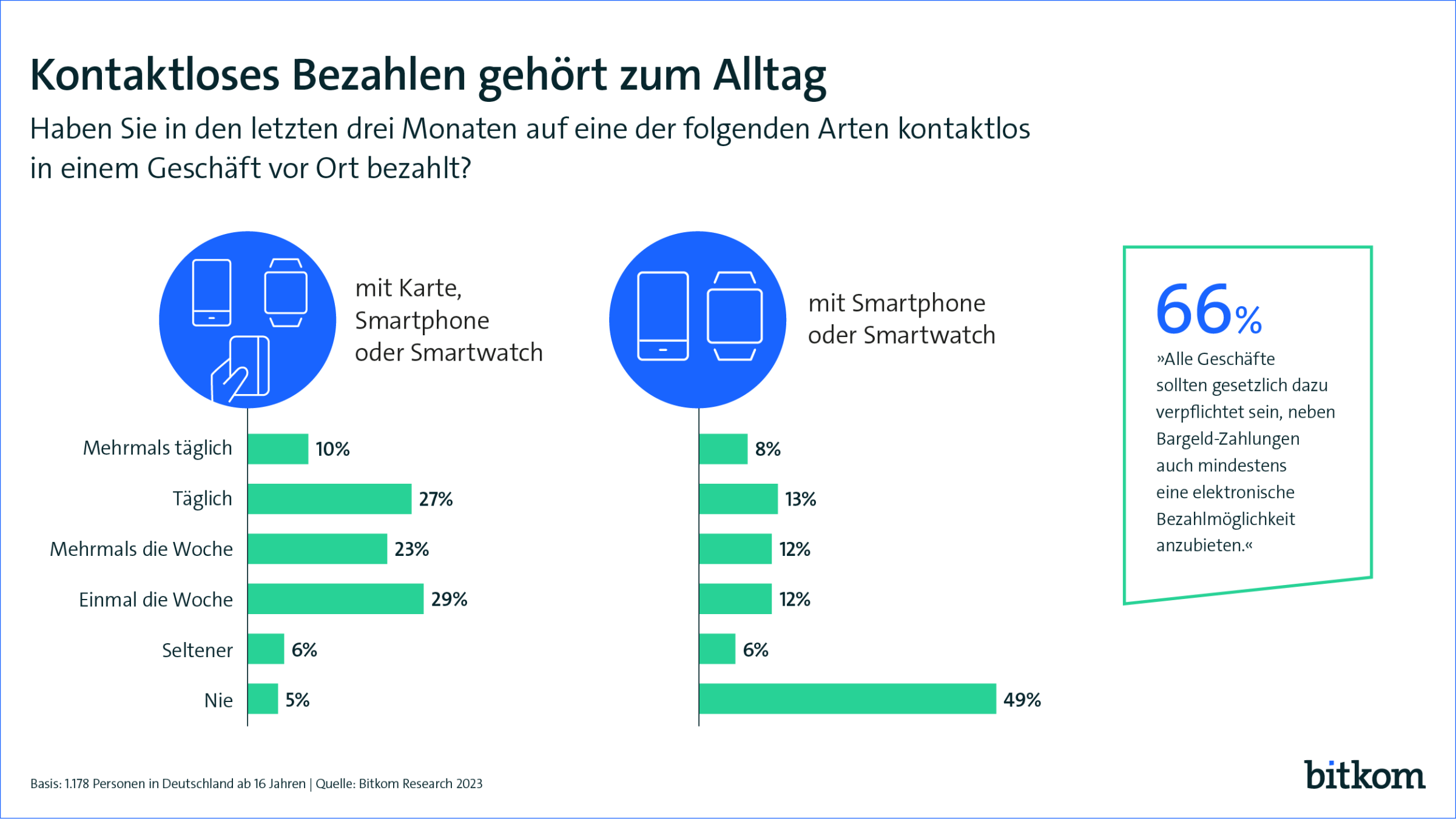 Zwei Drittel der Deutschen (66 Prozent) wünschen sich eine gesetzliche Pflicht für Geschäfte, neben Bargeld-Zahlungen auch mindestens eine elektronische Bezahlmöglichkeit anzubieten. Zu diesem Ergebnis kommt eine repräsentative Umfrage des Digitalverbands Bitkom.