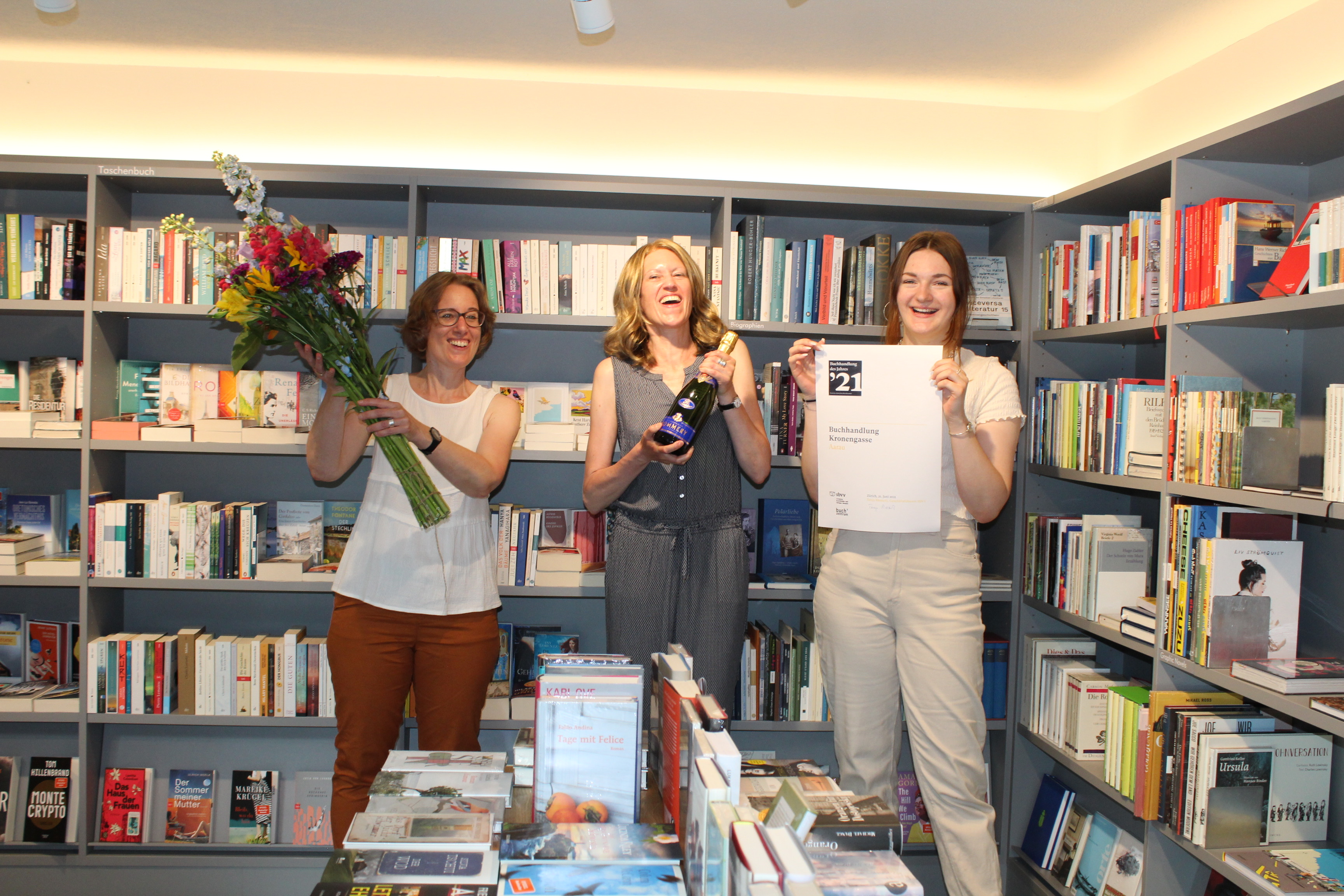 Zur Buchhandlung des Jahres wurde die Buchhandlung Kronengasse in Aarau gekürt. Die Geschäftsführerinnen Ursina Boner und Ursula Huber freuten sich riesig über ihren Sieg: "Er ist ein Zeichen dafür, dass unsere Arbeit grosse Wertschätzung geniesst", sagt Boner. Ihre Geschäftspartnerin Ursula Huber empfindet die Auszeichnung als "eine tolle Motivationsspritze", sie "bestärkt uns darin, so engagiert wie bisher weiterzumachen." Das Preisgeld wollen die Buchhändlerinnen in eine neue Website investieren. Der jetzige Webauftritt sei veraltet, es werde Zeit für frischen Wind. Eigentlich wollten die beiden dieses Projekt bereits früher in Angriff nehmen, aber nach dem Umbau der Buchhandlung vor rund zwei Jahren lag es finanziell nicht mehr drin. Dieser Umbau war indirekt auch für den Erfolg bei der Wahl zur Buchhandlung des Jahres verantwortlich. Ursina Boner und Ursula Huber hatten ihn mittels Crowdfunding finanziert. Für "diese Schweizer Pionierleistung in der Buchhandelsbranche und für das unermüdliche Engagement bei der Kundschaft sowie der Schülerschaft der Bezirks- und Kantonsschulen" nominierte die Jury des SBVV die Kronengasse. Die Buchhandlung existiert bereits seit 28 Jahren und ist die einzige unabhängige Buchhandlung in Aarau; Boner und Huber übernahmen das Geschäft 2017.