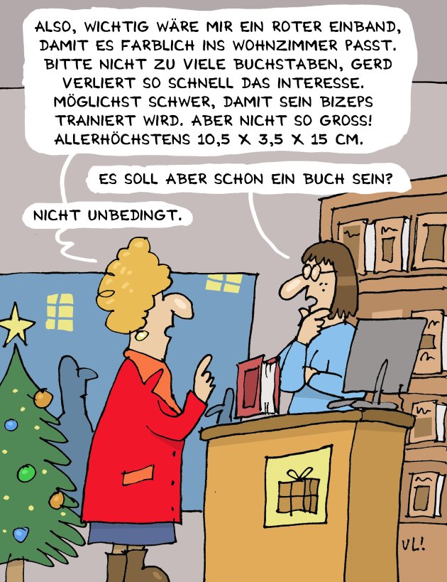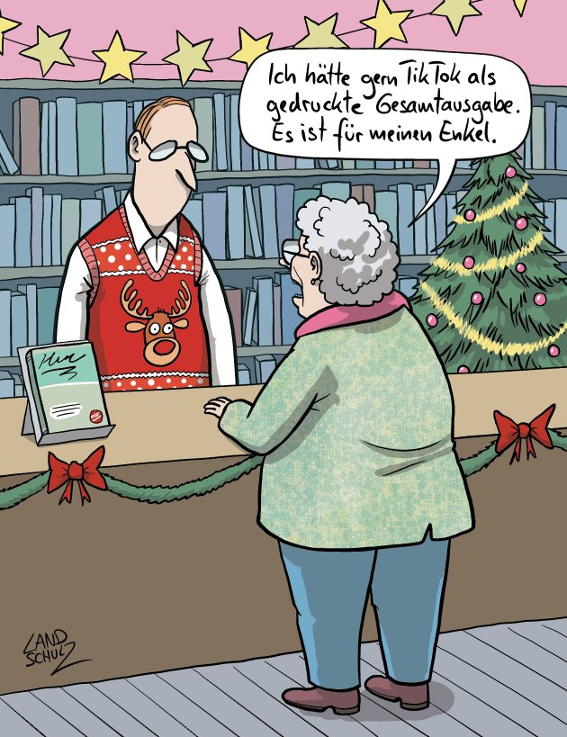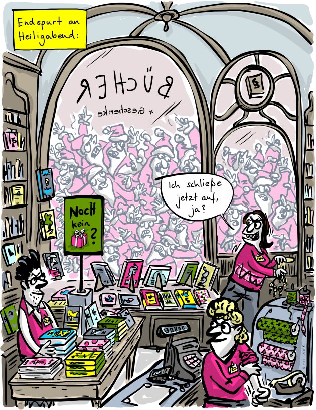 Der Cartoon mit den meisten Stimmer wird nun auf festem Papier gedruckt und liegt dem Börsenblatt 22 vom 31. Oktober bei – zum Aufhängen im Laden, wo Sie ab und zu mal (heimlich) hinschauen können. Wir hoffen, dass Ihnen die gedankliche Pause im Trubel guttut. Fröhliche Weihnachten!