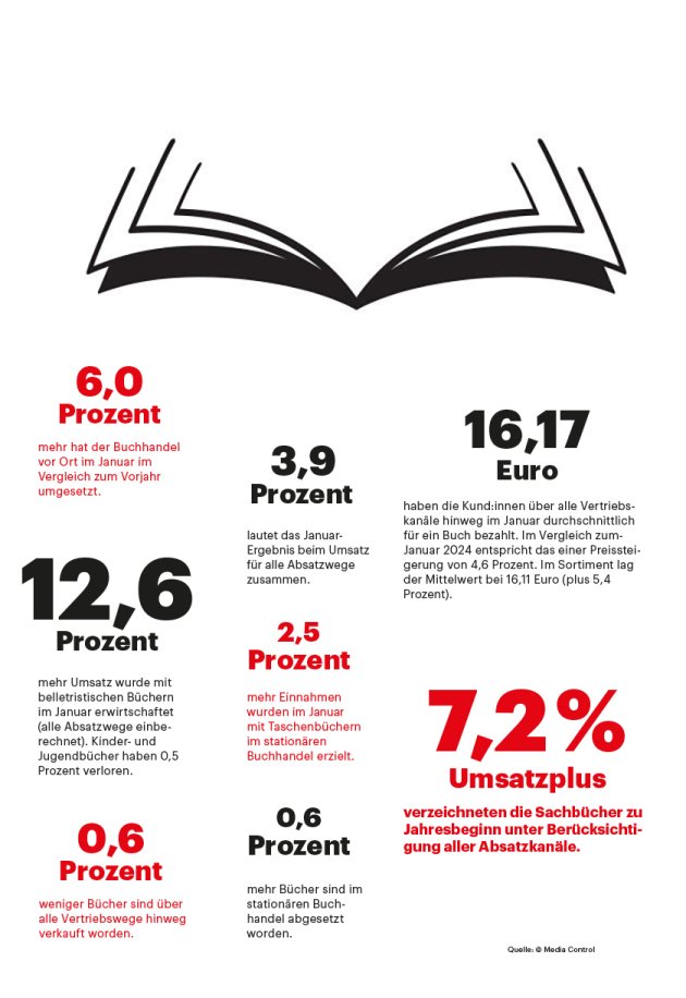 Im Januar sind die Umsätze im Buchhandel gestiegen, sowohl im Sortiment als auch bei allen Vertriebswegen zusammen. Eine Absatzsteigerung gab es ebenfalls. Hier sind die aktuellen Zahlen aus dem Branchen-Monitor Buch des Börsenvereins.