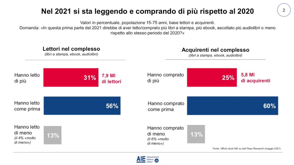 Von 4. Januar bis 20. Juni 2021 wurden nach einer Analyse des italienischen Verlegerverbands AIE, die auf den Daten von NielsenIQ basiert, 15 Millionen mehr Exemplare gedruckter Bücher in den Handelskanälen (d. h. im Buchhandel, online und physisch, sowie im Großvertrieb ohne Schulen) verkauft. Das ist ein Plus von 44 Prozent im Vergleich zum Vorjahreszeitraum. Die Verkäufe brachten der Branche über 207 Mllionen Euro mehr ein als 2020 (+42%) und 156 Mllionen Euro mehr als 2019 (+28%). Die Gesamtumsätze lagen im Buchmarkt in diesen ersten sechs Monaten bei 698 Millionen Euro.