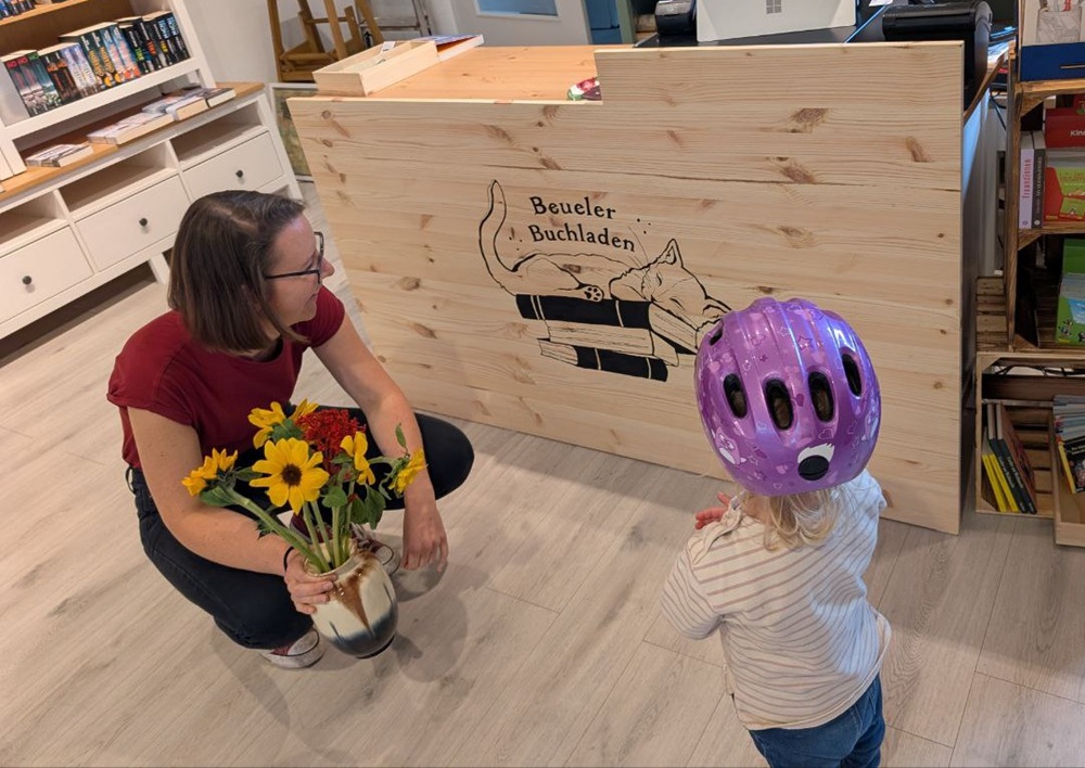 Erste Gratulationen für Viviane Richarz zur Eröffnung des Beueler Buchladens