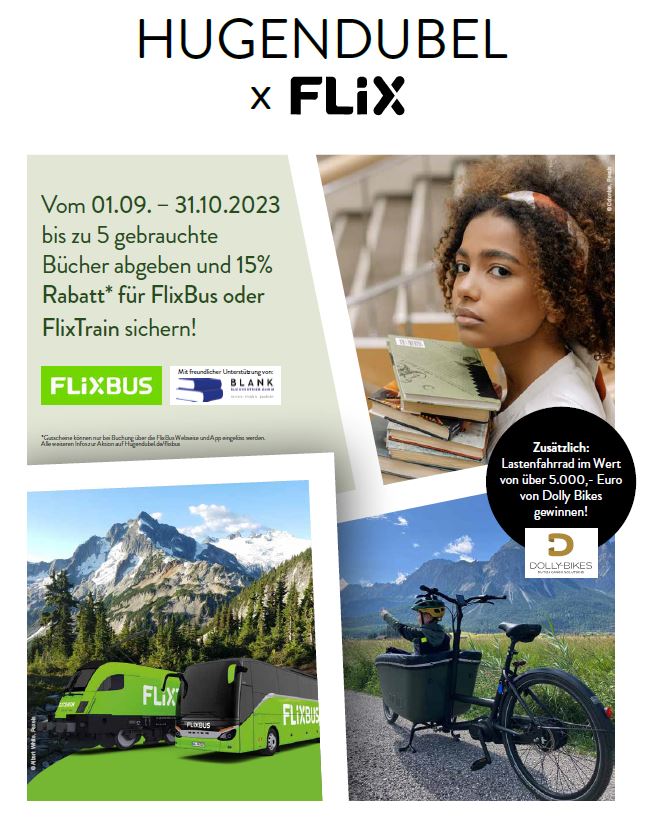 Nach dem Erfolg im Sommer 2022 legt man in diesem Jahr eine zweite Buchspende-Aktion auf, schreibt Hugendubel in einer Presseinformation. Als Dankeschön für die Buchspende bei Hugendubel erhalten die Teilnehmer:innen Rabatt-Coupons für ihre nächste Fahrt mit FlixBus und FlixTrain.