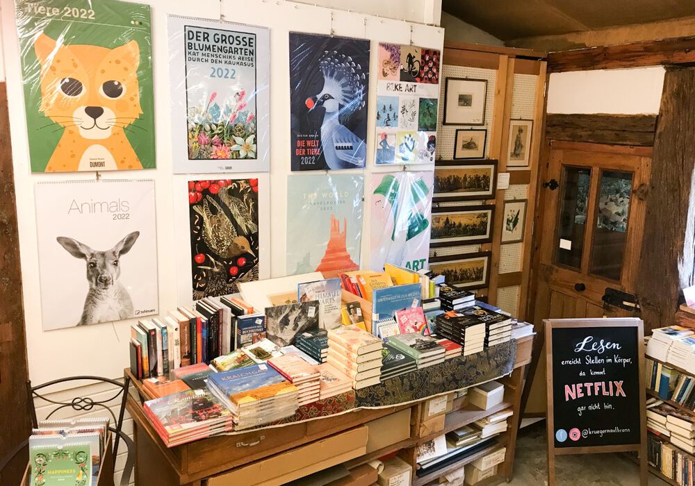 Im Nordschwarzwald kündigt sich das Jahresende schon im Sommer an. Denn bereits ab Ende Juni können sich Kund*innen in Maulbronn in einer Kalenderausstellung nach den Jahresbegleitern für 2022 umsehen. »Wir nutzen jeden freien Fleck. Die Kalender sind mittendrin«, sagt Buchhändlerin Franziska Kranidis. Auf der verwinkelten Ladenfläche der Buchhandlung Krüger im alten Gemäuer direkt im Eingangsbereich zum Klosterhof Maulbronn ist Improvisationstalent gefragt: An Wänden, den Balken und auf Tischen findet sich vom Paperblanks bis zum großformatigen Fotokalender ein breites Sortiment. Im Souterrain wird dann schon mal ein Stich von Hermann Hesse, wohl der bekannteste Schüler des Maulbronner Klosterseminars, abgehängt, um Kalendern Platz zu machen. »Die Leute sind jedes Jahr aufs Neue überrascht, dass es schon losgeht – doch die Erfahrung zeigt auch, dass es gut angenommen wird und einige Kalender bald vergriffen sind«, berichtet Kranidis.