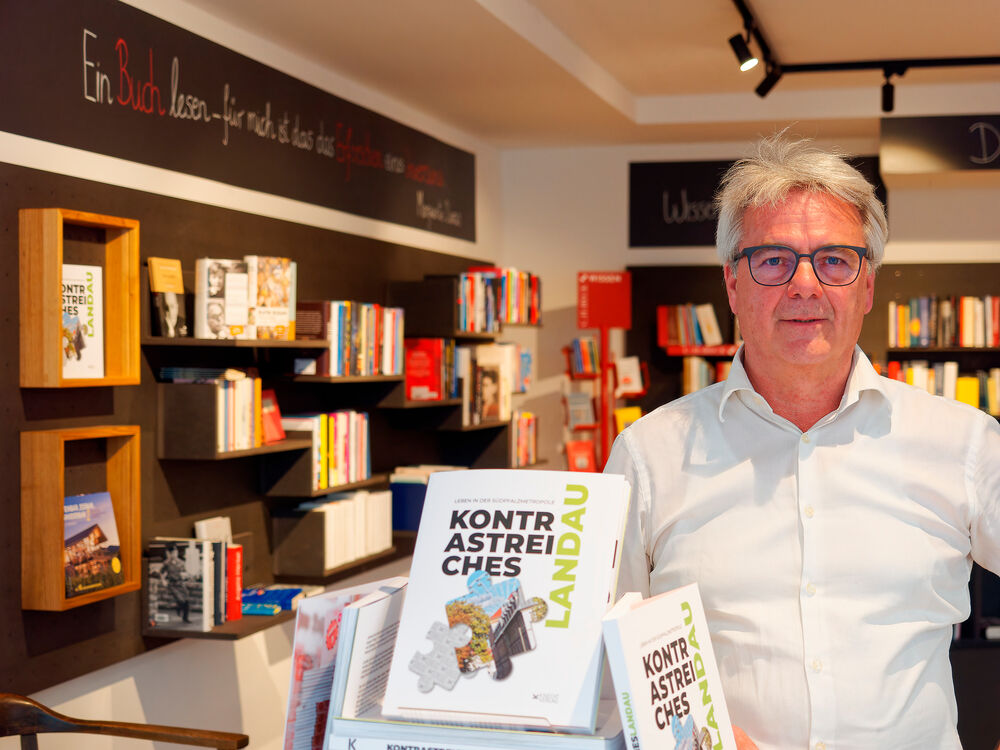 Einen festen Platz im Geschäft haben natürlich auch die Titel aus dem KnechtVerlag. 160 Bücher sind hier seit 1993 erschienen, derzeit konzentriert sich Knecht dabei auf Bücher über Landau. Die Veränderungen der prosperierenden Stadt hat er in einer Neuerscheinung mit Fotos und Texten beschrieben: "Kontrastreiches Landau" dokumentiert anschaulich, wie alte und neue Innenstadtkonzepte nebeneinander bestehen, auch in unmittelbarer Nähe des BücherKnechts. Die benachbarte Königsstraße reiht etliche Einzelhandelsgeschäfte aneinander, aber auch Parkplätze auf beiden Seiten und bietet damit wenig Aufenthaltsqualität. Die Stadt bemüht sich um Zwischenlösungen wie zum Beispiel mobile Begrünungen, bis die Einkaufsstraße fertig saniert sein wird.