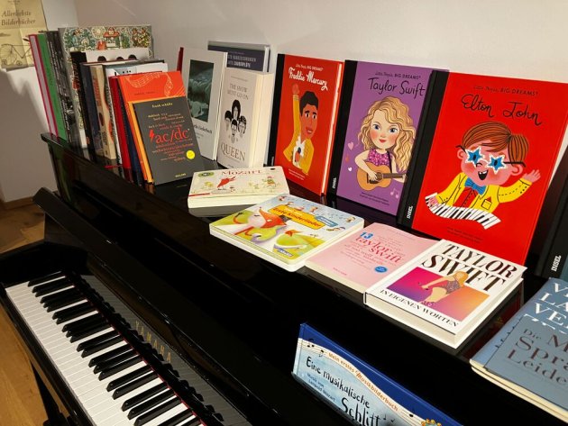 Das Klavier steht für Konzerte der Musikschule bereit - und für Bücher über Popkultur.