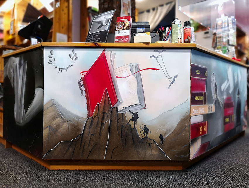 Was Kunst und Literatur verbindet, haben Inhaberin Stephanie Richter und der (nebenberufliche) Graffiti-Künstler und Schwiegersohn Steffen Schulz am Küchentisch diskutiert, gerade in der strengen Lockdown-Zeit, als der Zugang zu Kultur nicht mehr selbstverständlich war und schmerzlich vermisst wurde - bis plötzlich die Idee zu der Neugestaltung der Theke im Raum schwebte. Die gesprayte Kunst auf Hartfaserplatten ist nun der Hingucker im Laden. Eingeweihte (oder Stammkunden mit Familienanschluss) enträtseln kleine Botschaften, die in den Motiven versteckt sind - wie in guter Literatur eben.