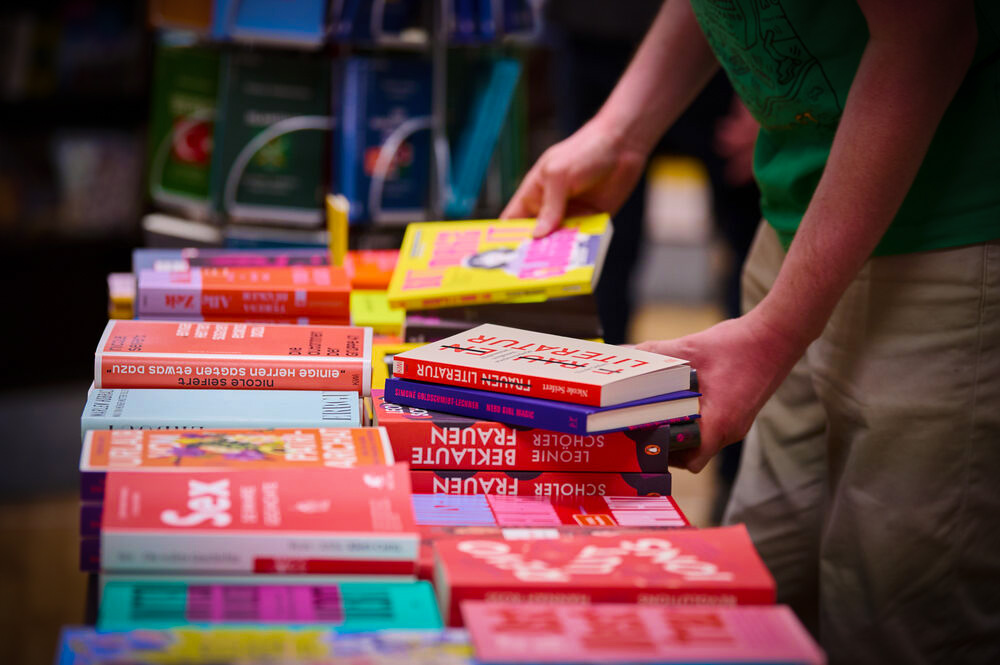 Ein Büchertisch zum Thema Feminismus wird in der Stephanus-Buchhandlung Karlsruhe sortiert (Mai 2025). Warum die Farbgebung der Cover überwiegend zwischen rosa, rot und lila changiert? Who knows ...