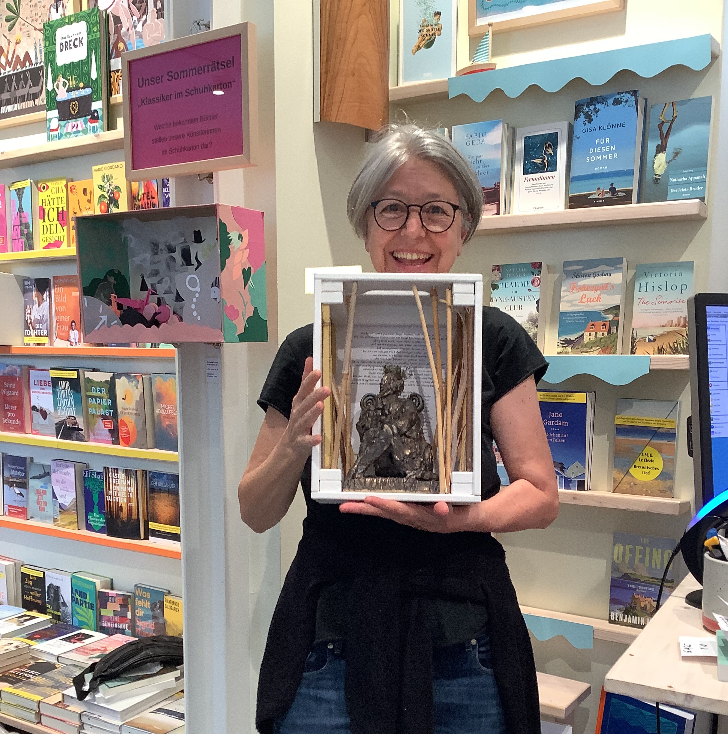 Welches Buch ist hier gemeint? In der Münchner Buchhandlung Buchpalast werden Buchklassiker im Miniaturformat als Blickfang für die Kundschaft inszeniert. Der Spaß ist groß.