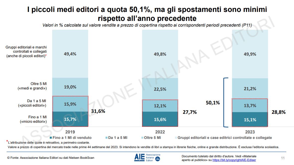 In den ersten elf Monaten des Jahres wurden in Italien mehr Romane italienischer Autoren und weniger von ausländischen Autoren gelesen als im Vorjahr: Während die italienische Belletristik beim Umsatz um 5 Prozent zulegen konnte, ging die ausländische Belletristik um 4,7 Prozent zurück. Ebenfalls rückläufig, nach dem Ansturm der vergangenen Jahre, sind die Comics: -13,0 Prozent gegenüber 2022 (allerdings, zum Vergleich: 2019 betrug der Anstieg 188,9 Prozent ....). Einen leichten Rückgang verzeichneten die Kinder- und Jugendbuchverlage (-0,7 %) und die Fach-/Sachbücher (-1,2 %), während die allgemeinsprachlichen Sachbücher (Populäres und Zeitgeschehen) um 5,5 % zulegten.
