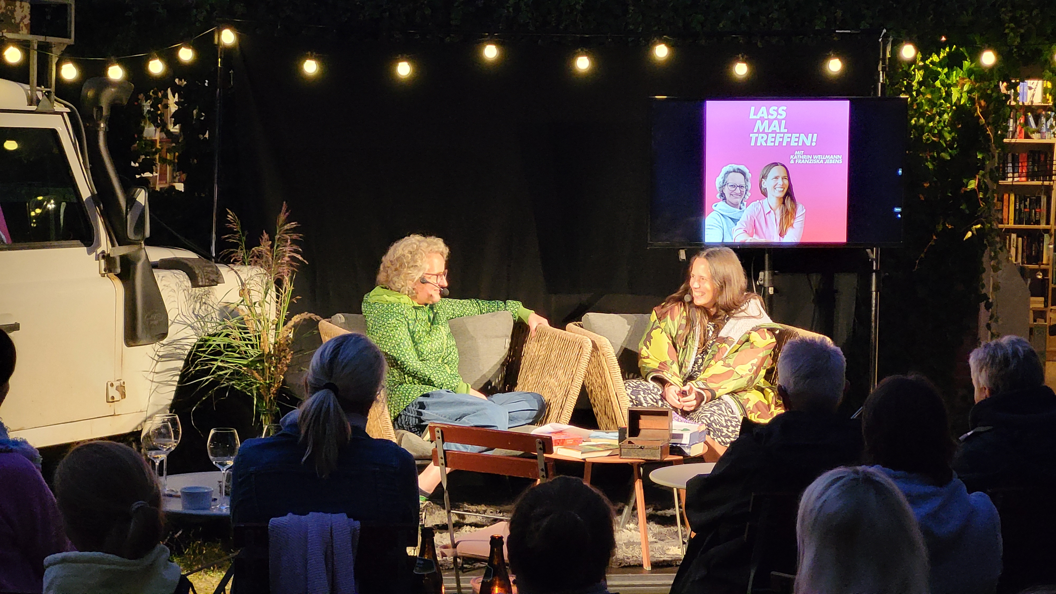 Im August fand auf dem Hof der Hofbuchhandlung in Oldenburg die Aufzeichnung der ersten Folge des neuen Interview-Podcasts "Lass mal treffen!" von Autorin Franziska Jebens statt. Gesprächspartnerin war die unabhängige Buchhändlerin Kathrin Wellmann, die über ihren beruflichen Werdegang, prägende Bücher und den Alltag im Sortiment sprach.