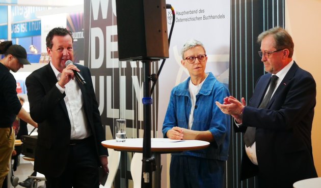 Verleger aus rund 80 österreichischen Verlagen, viele Gäste, deutsche Kollegen, Vorsteherin Karin Schmidt-Friedrichs, Preisbindungstreuhänder Dieter Wallenfels, Prolit-Chef Jochen Mende: Der Gang beim Empfang der Österreicher in Halle 3.1 der Frankfurter Buchmesse war gerammelt voll. Czernin-Verleger Benedikt Föger begrüßte als Präsident des Hauptverbands des Österreichischen Buchhandels und gratulierte zum neuen, mit der Republik ausgehandelten Schulbuchvertrag, der Bildungsgerechtigkeit für alle österreichischen Schülerinnen und Schüler bedeute. "Mit der Vereinbarung, die bis zum Schuljahr 2031/2032 gilt, wird der gesetzliche Auftrag erfüllt, dass Schulbücher gratis bleiben", erklärte Friedrich Hinterschweiger, Obmann des Fachverbandes der Buch- und Medienwirtschaft in der Wirtschaftskammer Österreich. Der bisherige Vertrag zwischen Bundeskanzleramt/Familienministerium und dem WKÖ-Fachverband der Buch- und Medienwirtschaft war ausgelaufen. Der Fachverband ist die gesetzliche Interessensvertretung aller Schulbuchverlage und aller Buchhandelsbetriebe. Hinterschweiger sprach auch die Mehrwertsteuerproblematik an: "In der Schweiz beträgt die Mehrwertsteuer auf Bücher 2,6 %, in Südtirol 4,6 %, in Deutschland 7 % und in Österreich 4 % – es wäre mehr als wünschenswert, wenn wir den Mehrwertsteuersatz in den deutschsprachigen Regionen harmonisieren."