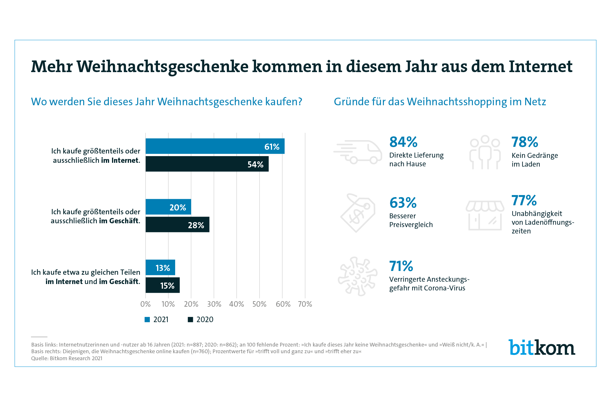 71 Prozent derjenigen, die ihre Weihnachtsgeschenke online kaufen, wollen so die Gefahr einer Ansteckung minimieren – im Vorjahr waren es 51 Prozent. Die Bitkom-Umfrage wurde vom 5. bis 19. November telefonisch durchgeführt, also mitten in der vierten Corona-Welle. Besonders Personen ab 50 Jahren ist die Sorge vor einer Ansteckung ein Grund für den Online-Kauf: So geben 80 Prozent der 50- bis 64-Jähringen sowie 79 Prozent der über 65-Jähringen an, deshalb Geschenke im Internet zu besorgen.