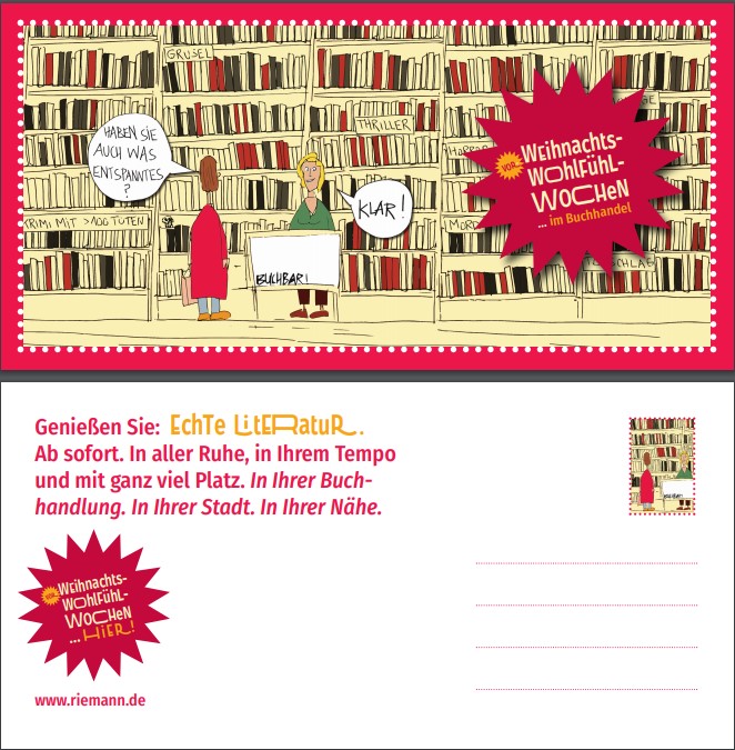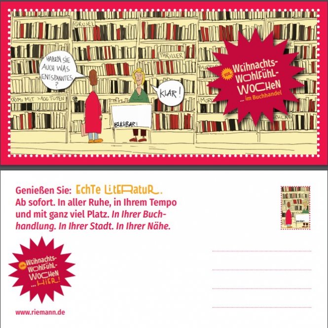 Der Buchhandelsverbund Nordbuch Marketing GmbH hat sich mit der Münchner Agentur Rheindorf.com eine Postkartenaktion ausgedacht, damit die 126 Buchläden von Nordbuch den "[Vor-] Weihnachts-Wohlfühl-Wochen" gelassener entgegensehen können. "Der Krise begegnet man mit Witz, dem Virus mit Abstand, dem Publikum wird viel Platz, viel Ruhe und damit eine Beratungsqualität versprochen, die im Showdown direkt vor Weihnachten tatsächlich kaum mehr denkbar ist", so Kai Schmidt von Rheindorf.com. Den Kunden wird empfohlen, sich in diesem Jahr früher aufzumachen und nach Weihnachtsgeschenken zu schauen.