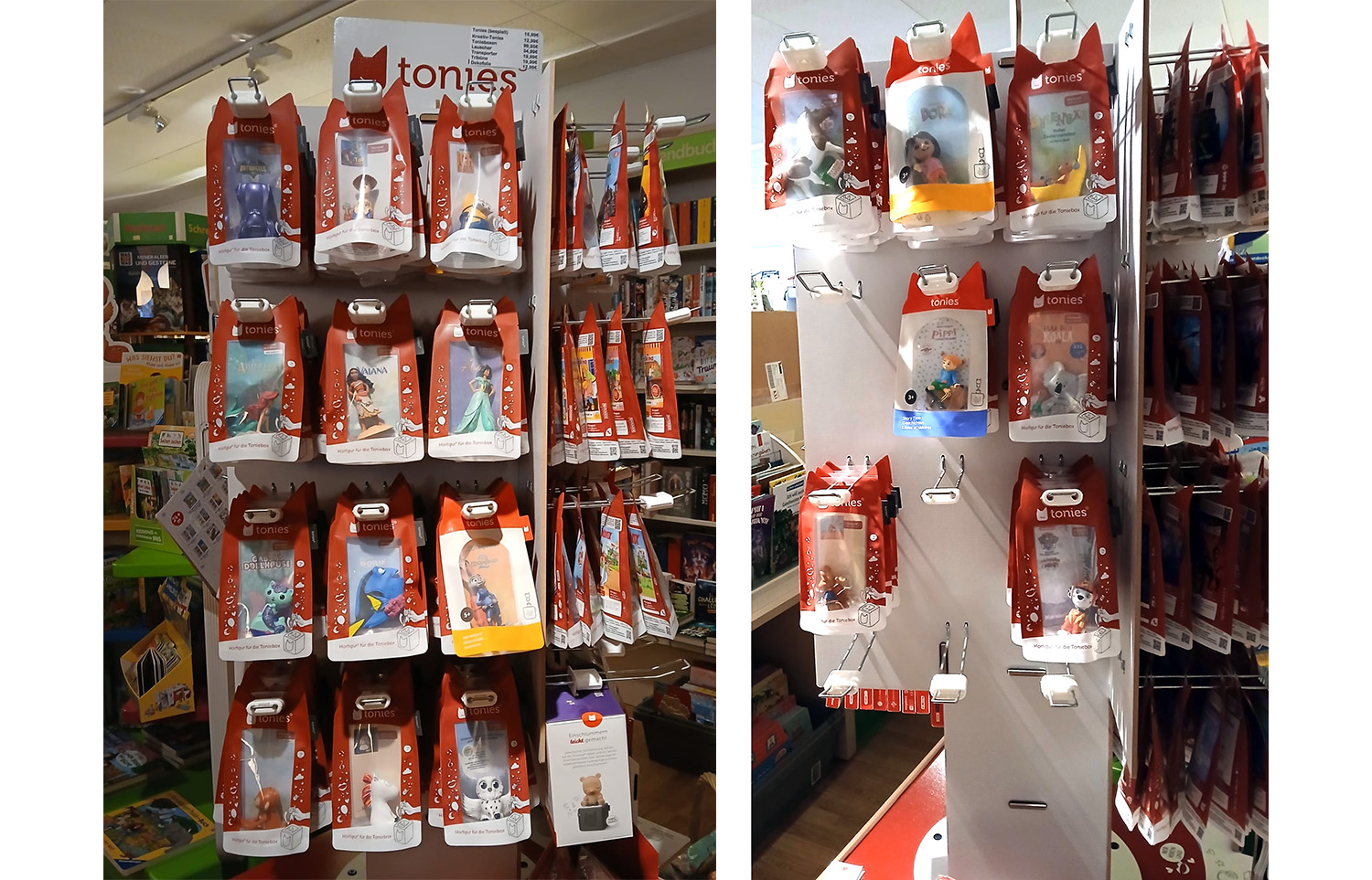 Die 117 Quadratmeter große Buchhandlung Bouya führt ein allgemeines Sortiment, darunter auch Kinder- und Jugendbücher. Rund 300 Tonies, gesichert, hängen im Laden. Da man schon mehrfach Opfer von Diebstählen war, allerdings nur je ein Exemplar je Tonie. Im Lager befindet sich natürlich Nachschub. Geklaut würden nur Tonies, nicht die Boxen. "Die Figuren kann man besser einstecken und bei Ebay verscherbeln", so die Buchhändlerin.