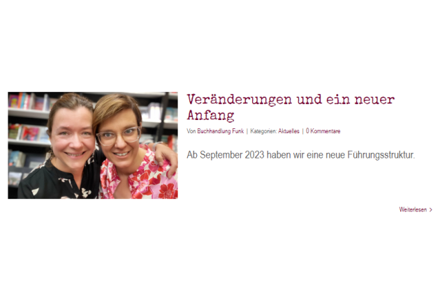 Über die Neuorganisation der Inhaberschaft schreiben sie offen und emotional auf ihrer Website unter dem Titel "Veränderungen und ein neuer Anfang" an die Kund:innen, Freundinnen und Freunde, Nachbar:innen und Geschäftspartner:innen der Buchhandlung Funk. Zunächst hatte Langendorfs Dienst darüber berichtet. Ab 1. September ist Pia Patt danach alleinige Eigentümerin und Geschäftsführerin der Buchhandlung Funk in Bergisch Gladbach (Schlossstraße 73). Sie übernimmt alle Anteile von Birgit Lingmann. Der Grund: Lingmann hatte sich vor zweieinhalb Jahren mit Corona infiziert und leidet seitdem an Post Covid. "Ich habe von der Infektion chronische Kopfschmerzen zurückbehalten. Je nach Intensität kommt noch eine Konzentrationsschwäche dazu. Ein normaler Arbeitseinsatz, ein Vollzeit-Berufsleben ist seitdem nicht möglich", erläutert sie. Zwar konnte sie den Zustand schon deutlich verbessern, aber die Verbesserung laufe nur sehr langsam ab. Daher habe sie beschlossen, "mir den Druck zu nehmen und aus der Unternehmensführung auszusteigen". In der Buchhandlung gehe es aber genauso weiter wie zuvor. Die Veränderung betreffe nur die Führungsspitze.