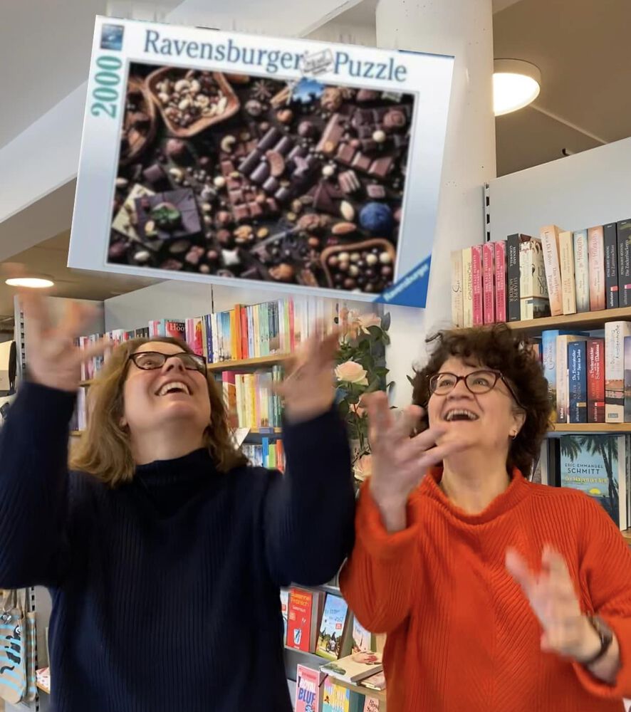 »1000 Teile wären zu einfach!«, lacht Katrin Schmidt. Ihre Buchhandlung Lesezeichen lädt Kund:innen zu einer besonderen Aktion ein: Ein schwieriges 2000-Teile-Puzzle will seine Meister finden. Nun wissen die Germeringer, womit sie ihre Mittagspause verbringen können – und manch ein Puzzle-Fan hat völlig die Zeit vergessen und mehrere Stunden am Tisch verbracht. Alles dient einem guten Zweck: 10 Cent pro richtig gelegtem Puzzleteil spendet die Buchhandlung an eine Einrichtung der Jugendhilfe für das gesellige Angebot »Gemeinsam kochen, gemeinsam essen«. Das Motiv des großen Ravensburger-Puzzles: Schokolade. Mmmh!
