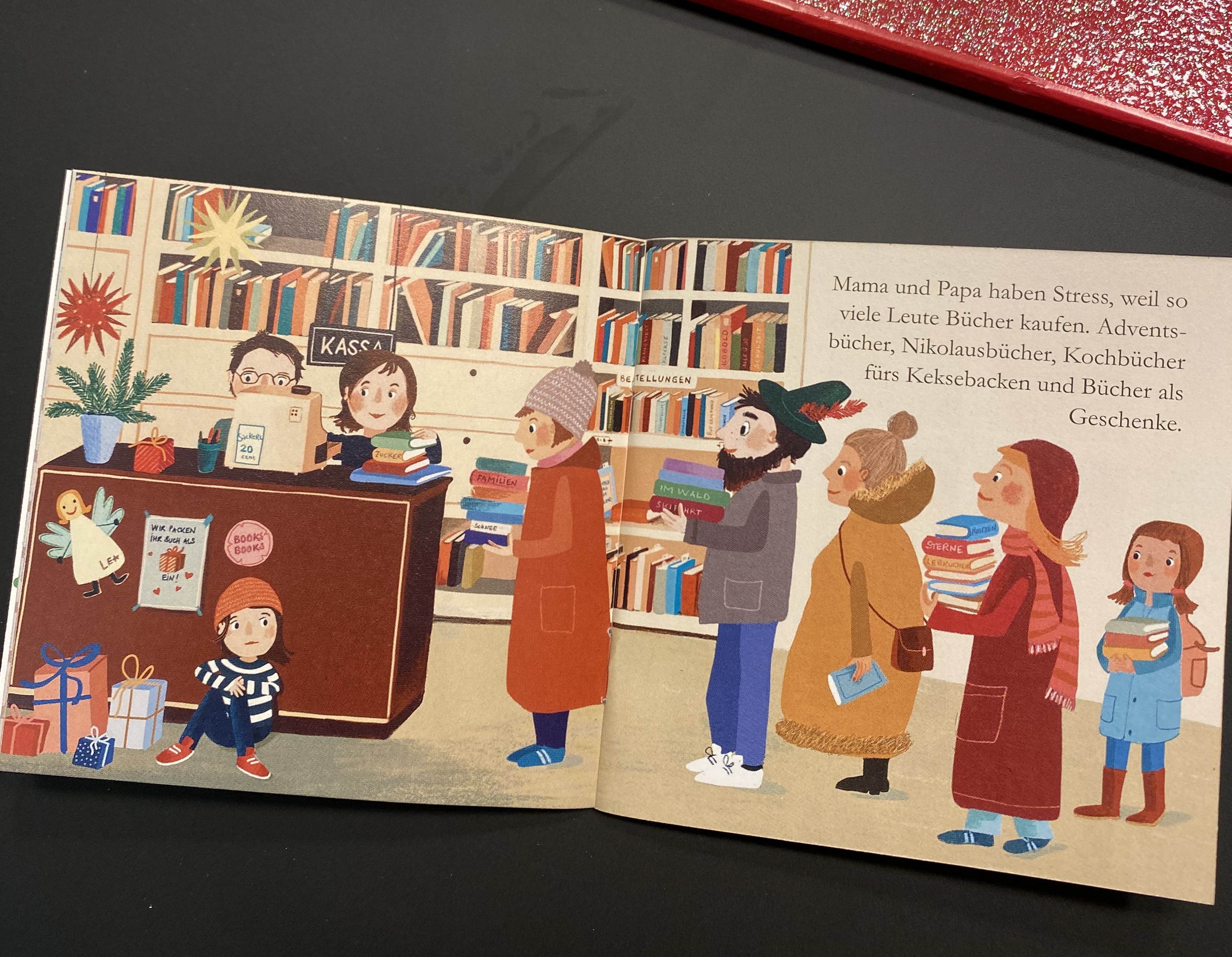 Geschrieben hat es die Wiener Buchhändlerin Petra Hartlieb, illustriert Nini Alaska und auf die Idee kam Carlsen-Programmleiter Frank Kühne: "Ich dachte mir, das wird sicher vielen Kindern und Familien Lust machen auf einen vorweihnachtlichen Besuch in ihrer Buchhandlung." In dem Pixi-Buch geht es um den alljährlichen Weihnachtswahnsinn in einer kleinen Buchhandlung. Tonis Eltern sind Buchhändler und kommen vor lauter Verkaufen, Beraten, Bestellen und Einpacken fast nicht dazu, Toni einen Adventskalender zu besorgen – zum Glück klappt es auf den letzten Drücker doch noch (und Toni bekommt keinen Pixi-Adventskalender). Da sich der Pixi-Adventskalender 50.000-mal verkauft hat, dürften also ebenso viele Kinder die Anregung hinter dem 1. Türchen mitnehmen.