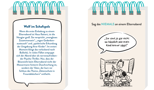 Wer möchte ohne diese zwei Unterstützer zum nächsten Elternabend gehen? Alle Eltern von Kindergarten- und Schulkindern sollten sie auf dem Weg ins Klassenzimmer im Rucksack haben. Wer sie nicht geschenkt bekommt, der sollte sie sich schleunigst selbst schenken – denn der nächste Elternabend kommt bestimmt!