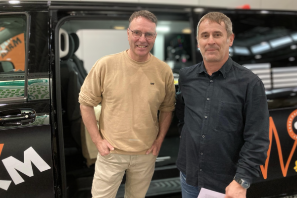 Edward van de Vendel (links) und Ralf Schweikart vor dem Podcast-Bus auf der Leipziger Buchmesse 2024