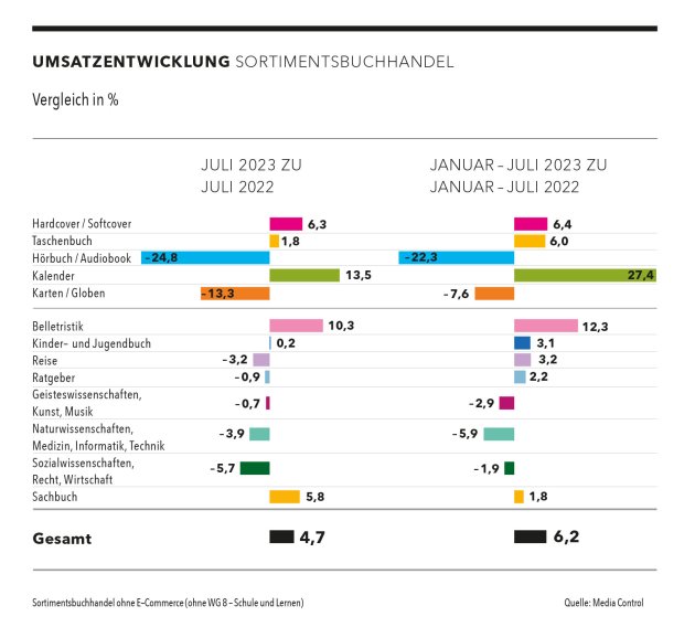 Die Bilanz nach sieben Monaten weist folgende Zahlen aus: Im Vergleich zu Januar bis Juli 2022 haben die Buchhandlungen ihre Messlatte um 6,2 Prozent übersprungen. Die Preise für ein verkauftes Buch liegen um 4,9 Prozent höher als 2022, die abgesetzten Mengen erhöhten sich um 1,3 Prozent.
