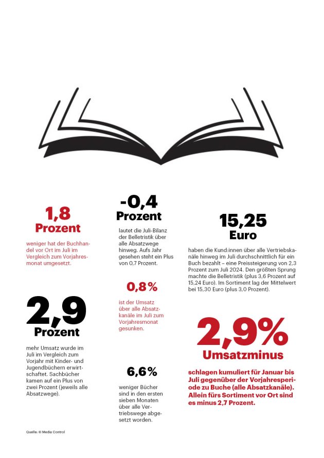 Der Juli endete sowohl für das Sortiment als auch für alle Absatzwege zusammen im Minus. Bei den Warengruppen lief es am besten für die Kinder- und Jugendbücher. Das zeigt der Branchen-Monitor Buch, den Media Control im Auftrag des Börsenvereins erhebt.