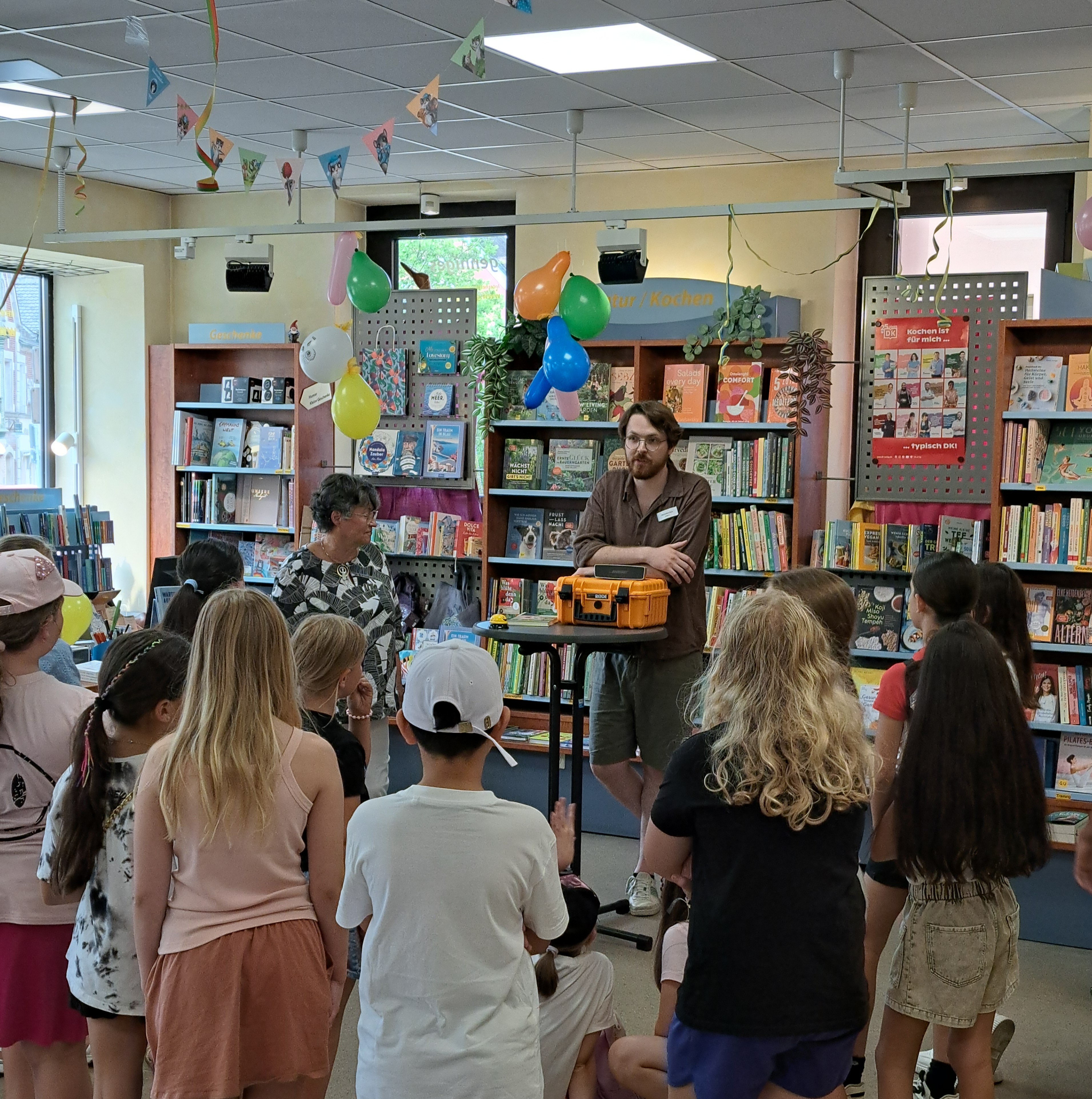 Mit dem Podcastkoffer des Bücheralarms fuhr Maximilian Stein an zwei Schulen und nahm dort in einer 4. und einer 7. Klasse jeweils einen Podcast über ein Buch auf, das die Schüler:innen zuvor gemeinsam gelesen hatten. Unterstützt durch die Klassenlehrkraft wurde ein Konzept für das Format "BÜCHERALARM@school: Der Bücher-Podcast aus der Schule" entwickelt und Texte vorbereitet. Die Buchhandlung selbst brachte das Projekt an die Schulen, schulte die Lehrkräfte, stellte die Technik bereit, half bei der Aufnahme, schnitt den fertigen Podcast und koordinierte das Projekt im Hintergrund – in enger Abstimmung mit Lena Stenz, Gründerin der Initiative vom Bücheralarm. Zudem hatten die Schüler:innen die Möglichkeit, die Autor:innen der gelesenen Bücher persönlich zu interviewen. "Die Gelegenheit, mit zwei Bestsellerautor:innen zu sprechen, hat man nicht alle Tage!", erzählt Maximilian Stein.