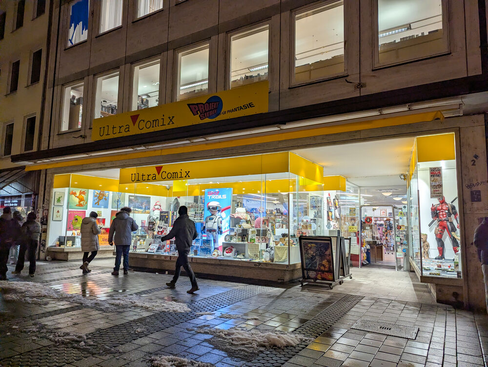 Es ist kurz vor Ladenschluss, das gelbe Schild mit der Aufschrift "Ultra Comix" an der Fassade der Vorderen Sterngasse 2 leuchtet im Dunkeln, immer wieder bleiben Menschen vor den großen Schaufenstern stehen oder betreten ungeachtet der Uhrzeit noch den Laden.