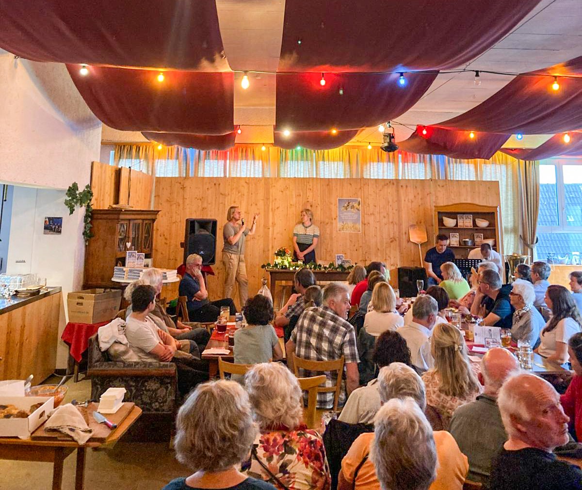 Ausverkauft: Martina Bogdahn war auf Einladung der Buchhandlung Mahr in Hörvelsingen – musikalisch begleitet vom Klapptischduo an Tuba und Saxofon.