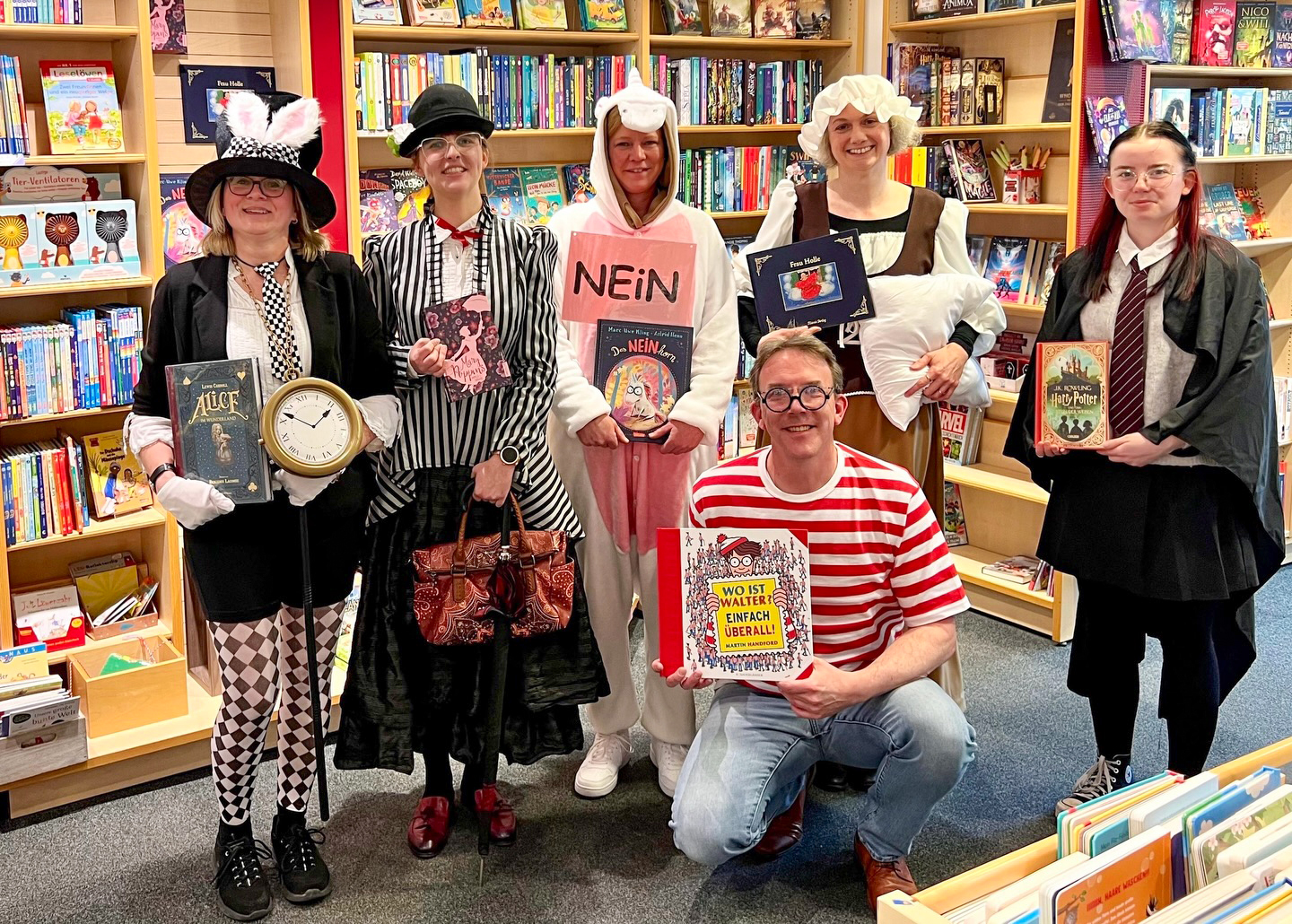 Ein Foto des Teams der Buchhandlung Sedlmair verkleidet wie ihre Buchhelden. Das weiße Kaninchen aus "Alice im Wunderland", Mary Poppins, das Neinhorn, Frau Holle, eine Hogwartsschülerin aus "Harry Potter" (von links), davor hockend: ein Mitarbeiter verkleidet als Walter aus der "Wo ist Walter"-Reihe