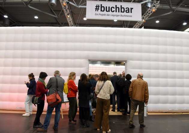 Was auf der Frankfurter Messe das „Baiser“ (der weiße Frankfurt Pavilion), ist in Leipzig die „buchbar“: ein architektonisch auffallendes Veranstaltungsforum für Top-Autoren. Hier spitzen neugierige Besucher:innen am Eingang hinein.