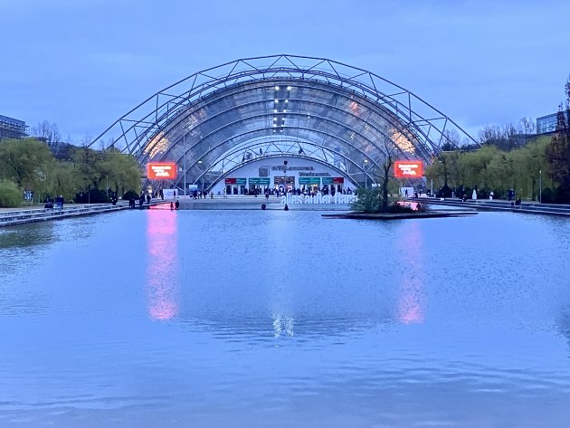 Die Glashalle zur blauen Stunde.