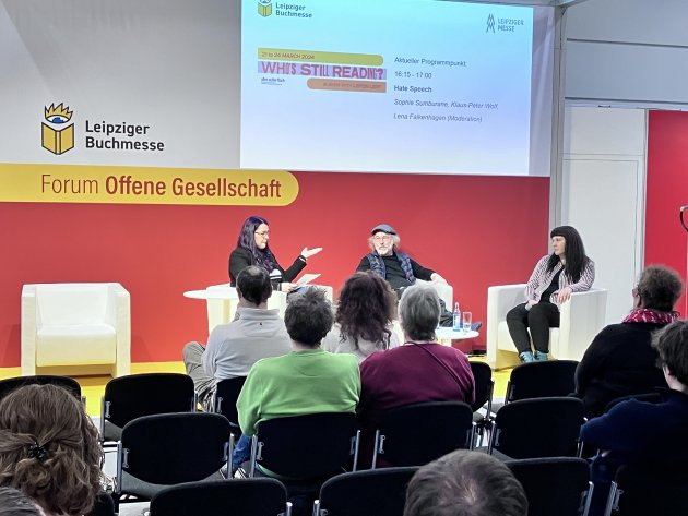 Lena Falkenhagen, KD Wolf und Sophie Sundurame diskutierten über die Aushandlung von literarischer und persönlicher Freiheit. „Künstler sind doch keine Schießbudenfiguren, wo jeder drei Wurf frei hat!“, so Klaus Peter Wolf.