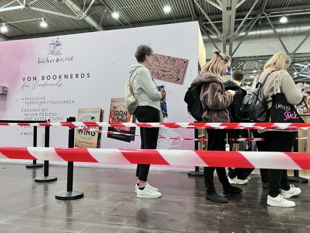 Wo sich viele junge Leute anstellten, gab es Farbschnittausgaben. Die Verlage hatte nicht nur ausreichend Bücher und Absperrband disponiert – auch Wachleute, die an den Wegkreuzungen die Gänge freihielten. Hier am Stand der Bücherbüchse.